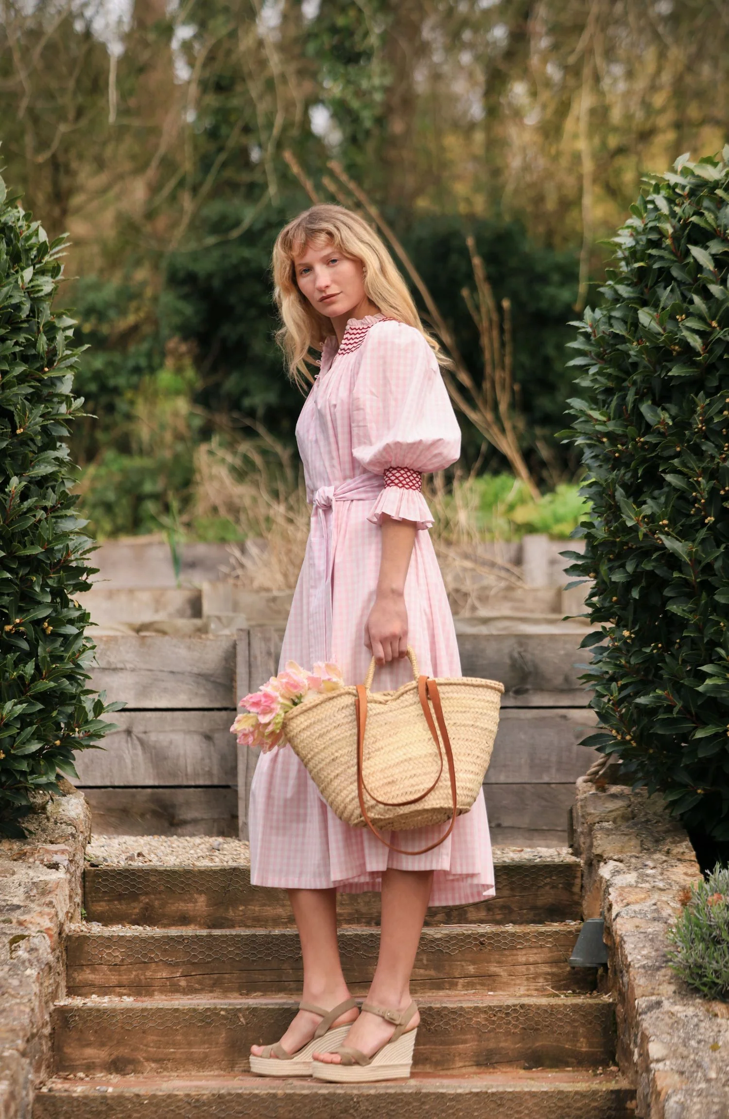 Inspired by the romantic tale of the world's first computer programmer, daughter of poet Lord Byron, this joyful gown is made from acres of pale pink gingham cotton gathered into a classic Bishop Smock neckline adorned with a blaze of hand smocked zigzags in ruby red threads. The A-line shape, raglan shoulder and keyhole opening create a flattering vertical silhouette that is softened and enhanced by a wealth of unapologetically feminine details - a dainty frill neckline, dramatic blouson sleeves with richly smocked cuffs, a wonderfully generous frill finish, cross-stitch trim and a detachable sash tie. Add it all together to create a show stopping smocked frock sure to keep you warm and fabulous.
