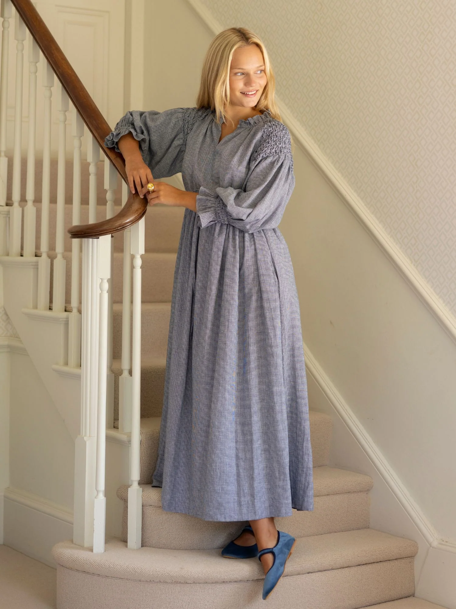 Named after “The World’s most widely travelled woman” comes a dress full of adventure! A veritable Indiana Jones of her time, Aloha was the first woman to drive around the world by car, driving a Ford model T across 75 countries on 6 continents, starting out at just age 16. A pioneer, author, explorer, Queen of Adventure, filmmaker and aviatrix, her namesake dress celebrates this dramatic legacy with drama in all the right places: a trapeze a-line skirt with drawstring waist and gathered bodice create a super flattering silhouette through the body, which is perfectly balanced by dramatic blouson sleeves featuring rich honeycomb smocking into the shoulder seam and hand smocked cuffs with extravagant frill. Made from a exquisite navy herringbone linen, the dress is finished with a small frill collar and a simple key hole opening, making this frock all ready to unlock your next great adventure.