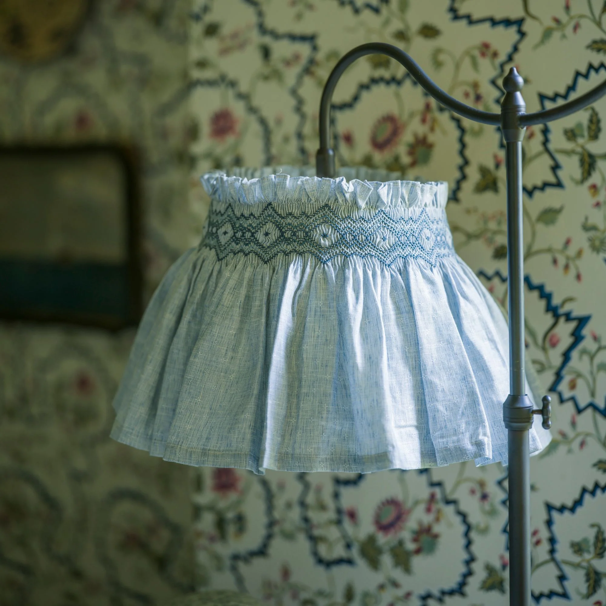 Named after the much loved grandmother of edit58's founder "Elsie" and Elsie de Wolfe, a woman who was aptly an icon of both sartorial and interior style in the 1930s, the Elsie Collection of skirt shades uses our signature hand smocking to create “waistbands” designed to hold the simple, cotton shades in place. Hand pleated and sewn by artisans in Vietnam the shades feature a nordic inspired zigzag stitch pattern composed of five-step trellis stitches interspersed with flowerettes in a medley of moody blue threads on a pleated canvas of delphinium-hued hand-loomed cotton. They are available in two sizes: Mini Skirts and Maxi Skirts.