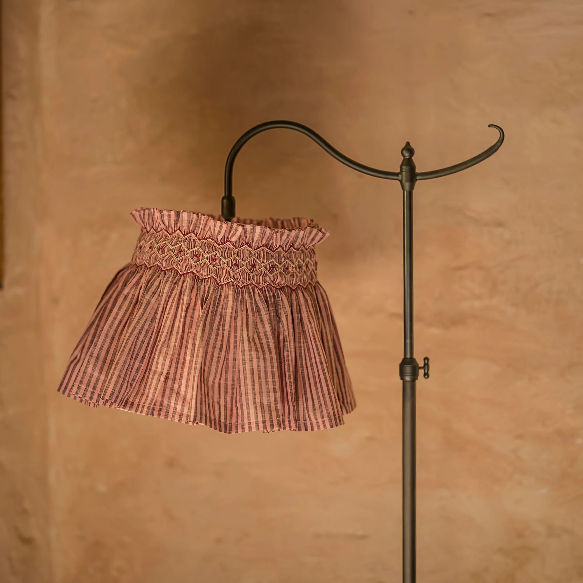 Named after the much loved grandmother of edit58's founder and Elsie de Wolfe, a woman who was aptly an icon of both sartorial and interior style in the 1930s, the Elsie Collection of skirt shades uses our signature hand smocking to create “waistbands” designed to hold the simple relaxed cotton shades in place. Hand pleated and sewn by artisans in Vietnam, the shade feature a pleated canvas of mulberry and pink striped cotton smocked with a chequerboard stitch pattern composed of interconnecting trellis-stitch zigzags interspersed with french knots in a tonal plum threads. They are available in two sizes: Mini Skirts and Maxi Skirts.