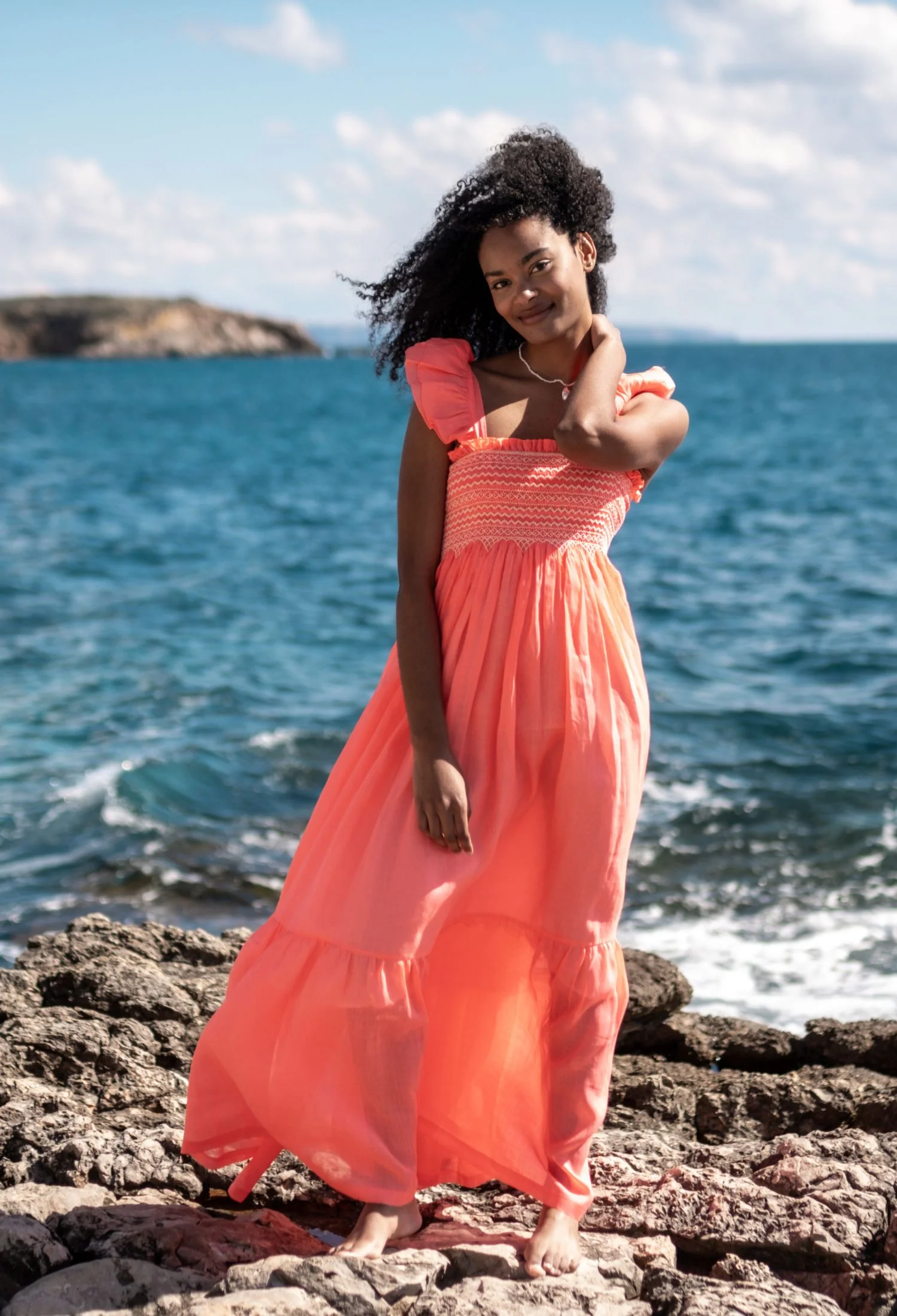 Channelling all the glamour and stature of the first woman to become Time Magazine’s Person of the year in 1936, the Wallace Dress combines impact and wow factor in fitting proportion. Turn heads in this maxi length gown made from a mesmerising neon coral Organdie fabric, exquisitely pleated into the central bodice emblazoned with a thousand hand sewn trellis stitches in pale cream threads.